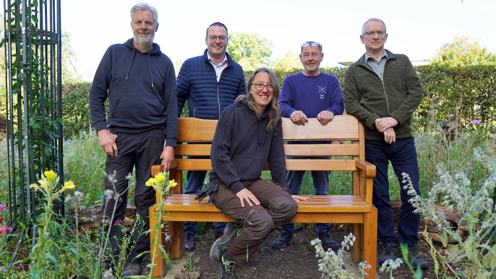 Zwei ausgediente Baumschutzgitter dienen künftig als Rankhilfe für neu gepflanzte Ramblerrosen. Die Gründung der Gitter sowie die gärtnerischen Arbeiten – von der Einsaat der Fläche über Pflanzungen bis zur Wegeführung – führten die Friedhofsgärtner Franzisca Hoffmann und Heiner Balke aus. Eine besondere Bereicherung ist zudem eine neue Ruhebank aus Lärchenholz, die der ortsansässige Tischler- und Bestatter Wilhelm Oeynhausen gefertigt und dem Friedhof kostenfrei zur Verfügung gestellt hat.