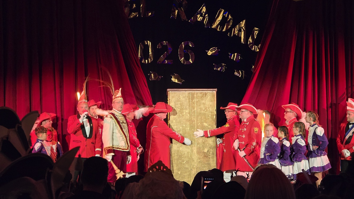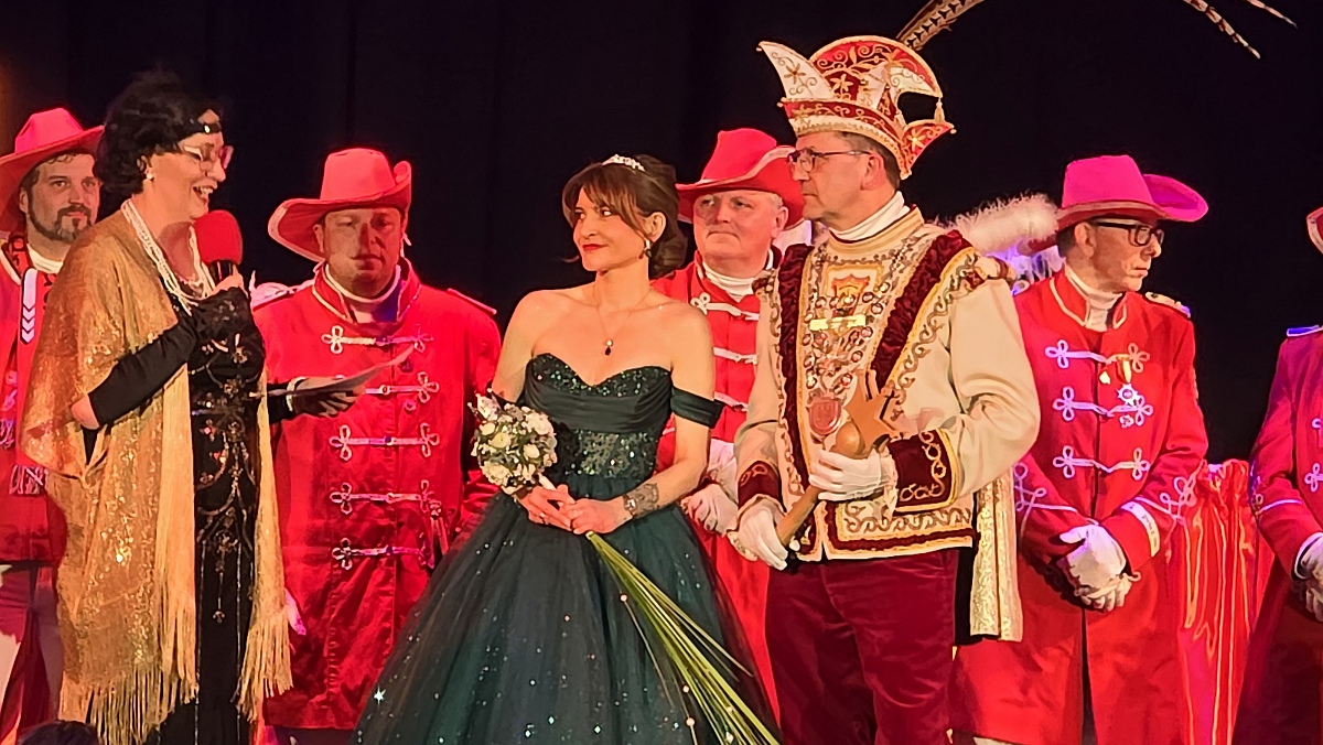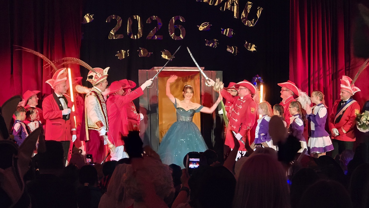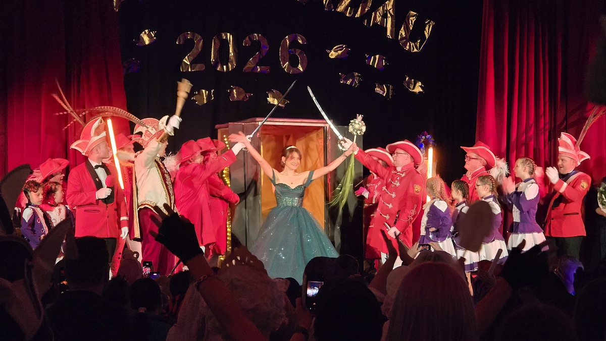 Brakel (TKu). Tosender Jubel, gespannte Erwartung und eine ausgelassene Stimmung prägten den vergangenen Samstagabend in der vollbesetzten Stadthalle Brakel. Die närrische Veranstaltung war ausverkauft, berichtet der Karnevalsverein. Erstmals feierte der Karnevalsverein „Brakel Radau“ hier den Höhepunkt des Saalkarnevals: die feierliche Proklamation der neuen Karnevalsprinzessin der Session 2026. Um exakt 21.32 Uhr wurde es besonders spannend. Der rote Samtvorhang schloss sich, eine geschlossene Sänfte, beziehungsweise geheimnisvolle Kiste, wurde durch den langen Mittelgang getragen und auf der Bühne abgestellt. Wenige Augenblicke später entstieg ihr Friederike Antonia Conze im netheauengrünen Festkleid. Mit ihrem Auftritt brandete tosender Applaus auf: Die 41-jährige Brakelerin ist die neue Karnevalsprinzessin und regiert die Brakeler Narrenschaft nun gemeinsam mit Prinz Mark I. Elberg, dem „vorbildlich lenkenden Superjeck“.