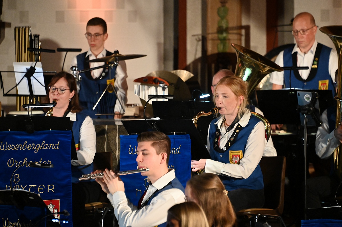 Kreis Höxter/Bödexen (TKu). Mehr als 100 Musikerinnen und Musiker aus dem Kreis Höxter sowie über 350 Zuhörerinnen und Zuhörer haben das Weihnachtskonzert des Projekts „Einklang“ zu einem vorweihnachtlichen Höhepunkt im Kreis Höxter gemacht. In der bis auf den letzten Sitzplatz gefüllten St.-Anna-Kirche in Bödexen herrschte eine besondere Atmosphäre: Es wurde mitgesungen, mitgeklatscht und am Ende dankte das Publikum den Mitwirkenden mit lang anhaltendem Applaus und Standing Ovations. Das Konzert war zugleich der erfolgreiche Abschluss eines außergewöhnlichen Musikprojekts im Kreis Höxter, das viele unterschiedliche Menschen zusammengebracht hat. Mit dem zweiten Konzert am vergangenen Sonntag in Bödexen ging das „Projekt Einklang“ offiziell zu Ende. Bereits eine Woche zuvor, am 6. Dezember, hatte das 100-köpfige Ensemble im Rahmen des Weihnachtsmarktes in der Fürstenauer St.-Anna-Kirche ihren ersten Auftritt. Beide Konzerte zeigten, was entstehen kann, wenn musikalisches Engagement, Offenheit und Gemeinschaftsgeist aufeinandertreffen. Über 60 Sängerinnen und Sänger aus dem gesamten Kreis Höxter standen gemeinsam mit dem Weserberglandorchester (WBO) aus Bödexen auf der Kirchenbühne und präsentierten ein abwechslungsreiches und stimmungsvolles Programm.