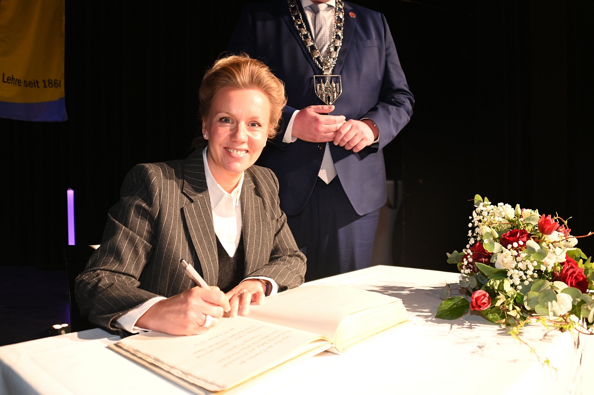 Veranstaltet wurde das Symposium vom Aktionskreis Lehre am Hochschulstandort Höxter. Ziel war es, ein deutliches Zeichen für die hohe Relevanz umweltbezogener Studiengänge und Forschungsaktivitäten am traditionsreichen Standort der Technischen Hochschule OWL zu setzen. Inhaltlich lag der Schwerpunkt insbesondere auf Wasser- und Gewässerschutz, Biodiversität und Klimafolgenanpassung. Die wissenschaftlichen Leiter, Professor Dr. Joachim Dohmann und Bernd Schackers, betonten, dass der interdisziplinäre Austausch praxisnahe und zugleich wissenschaftlich fundierte Perspektiven eröffne. Bereits vor der offiziellen Eröffnung nahm Ministerin Brandes an einem Rundgang durch die Ausstellung relevanter Umweltthemen teil, begleitet von der wissenschaftlichen Leitung sowie weiteren Repräsentanten aus Politik und Verwaltung. Anschließend trug sich die Ministerin in das Goldene Buch der Stadt Höxter ein, bevor Marlies Hemesoth von der Absolventen- und Förderervereinigung AFV Höxter e. V. den Startschuss für die Veranstaltung als erste Rednerin gab. Kreisdirektorin Manuela Kupsch würdigte in ihrer Ansprache die Bedeutung des Hochschulstandorts Höxter für die Umweltforschung und die nachhaltige Entwicklung der Region: Die große Resonanz mit fast 300 Teilnehmenden aus Nordrhein-Westfalen und weiteren Bundesländern sowie Repräsentanten aus Wirtschaft, Politik und Verwaltung sei ein starkes Zeichen für die Bedeutung umweltbezogener Studiengänge und Forschung. Kupsch weiter: „Das Hochschulpräsidium traf einst eine zukunftsorientierte Entscheidung und setzte die Weichen für diese Studiengänge am traditionsreichen Standort der Technischen Hochschule OWL. Ganz im Sinne der Nachhaltigkeit, die das Handeln von Klaus Töpfer prägte, wünschen wir uns auch heute kluge und zukunftsweisende Entscheidungen, um den Hochschulstandort mit umweltrelevanter Lehre und Forschung zu erhalten und weiterzuentwickeln.“ Kupsch hob hervor, dass der Kreis Höxter mit seinen zahlreichen Naturschutzgebieten und Projekten zur Aufwertung von Lebensräumen eine Vorreiterrolle im Umweltbereich einnehme. Sie betonte außerdem den Fachkräftebedarf für die Umweltverwaltung und die zentrale Bedeutung der Ausbildung junger Menschen in Umweltstudiengängen: „Klaus Töpfer hat junge Menschen stets darin bestärkt, sich für eine enkeltaugliche Welt einzusetzen, aber keinesfalls nur mit Protest. Er hat jungen Menschen gezeigt, wie sie die Zukunft im offenen Dialog mitgestalten können. Nachhaltiges Denken und Handeln, Kommunikation und Vermittlung zählten zu seinen Stärken.“