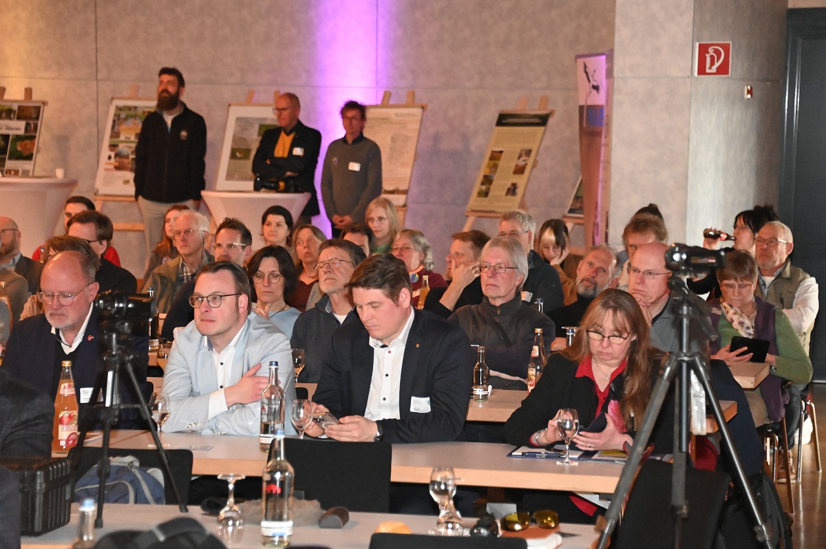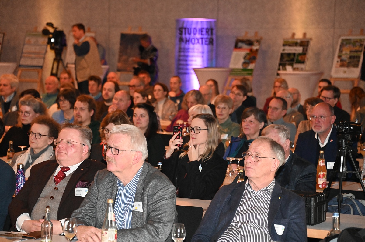 Auch Wissenschaftsministerin Brandes zeigte sich beeindruckt von der Unterstützung für den Hochschulstandort Höxter. Ihr Statement hätte nicht klarer sein können: „Wir brauchen auch die Studierenden aus dem ländlichen Raum mit ihren Erfahrungen, die sie hier gesammelt haben. Der Hochschulstandort steht im Studiengesetz, und daran hat sich bis heute nichts geändert. Ich bin sehr zuversichtlich, dass wir den Standort in Höxter behalten werden.“ Von einer ganz persönlichen Begegnung mit Prof. Dr. Klaus Töpfer berichtete sie ebenfalls. Dieser habe sich stets über alle Grenzen hinweg für den Umweltgedanken und die Nachhaltigkeit eingesetzt und sei ein sehr sympathischer Mensch gewesen. Bürgermeister Daniel Hartmann betonte die historische und symbolische Bedeutung der Residenz-Stadthalle, die 2004 von Klaus Töpfer eröffnet wurde: „Dass nun ausgerechnet hier das erste Klaus-Töpfer-Umweltsymposium stattfindet, ist mehr als ein schöner Zufall. Es ist ein deutliches Zeichen für die Bedeutung seines Lebenswerks. Klaus Töpfer hat gezeigt, dass Umwelt- und Klimaschutz keine Randthemen sind, sondern zentrale Zukunftsfragen für Städte, Regionen und die gesamte Gesellschaft. Nachhaltigkeit ist kein Einzelprojekt, sondern ein langfristiger Lernprozess, getragen von vielen Akteuren.“ Lutz Töpfer, Sohn des Namensgebers des Symposiums, begrüßte die Anwesenden ebenfalls und stellte die Verbindung seines Vaters zu dem Symposium heraus: Die Veranstaltung sei voll und ganz im Sinne seines verstorbenen Vaters. Er sei bekannt dafür gewesen, dass er sich für Nachhaltigkeit und Umweltschutz stark gemacht habe und wäre gerne selbst dabei gewesen, so Töpfer. Das Symposium bot ein abwechslungsreiches Programm aus Vorträgen, Diskussionen und Praxisbeispielen. Es verdeutlichte die Notwendigkeit des Dialogs zwischen Forschung, Politik und Praxis, um die Umwelt von morgen nachhaltig zu gestalten. Die hohe Beteiligung und die thematische Tiefe unterstrichen die Bedeutung des Klaus-Töpfer-Umweltsymposiums als überregionale Plattform für Umwelt- und Nachhaltigkeitsthemen. Der Hochschulstandort spiele dabei eine zentrale Rolle für die Ausbildung zukünftiger Umweltfachkräfte.